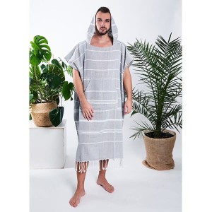 Lekkie i szybkoschnące poncho Hammam stworzone z tradycyjnego materiału używanego w łaźniach tureckich. Doskonale sprawdzi się po saunie, kąpieli lub na plaży. Świetnie chłonie wilgoć, zajmuje mało miejsca i jest wyjątkowo przyjemne w dotyku. Poncho posiada obszerny kaptur, praktyczną przednią kieszeń oraz tradycyjne frędzelki. Idealne jako okrycie podróżne, plażowe i saunowe.