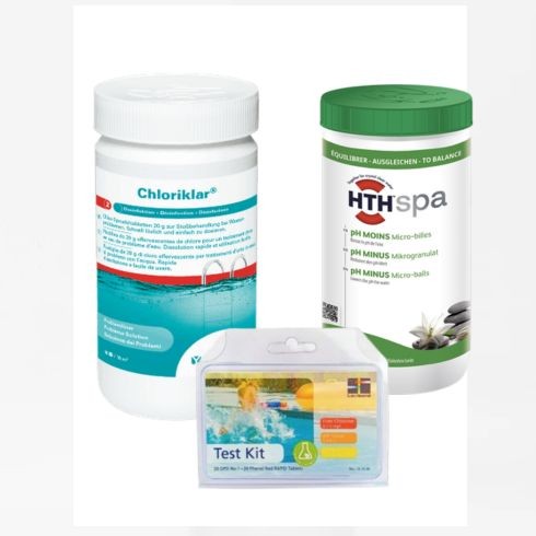 Zestaw startowy do chemii basenowej, służący do dezynfekcji wody basenowej. Ten zestaw dedykowany jest do małych basenów ogrodowych. W skład zestawu wchodzą podstawowe produkty służące do dezynfekcji wody basenowej: